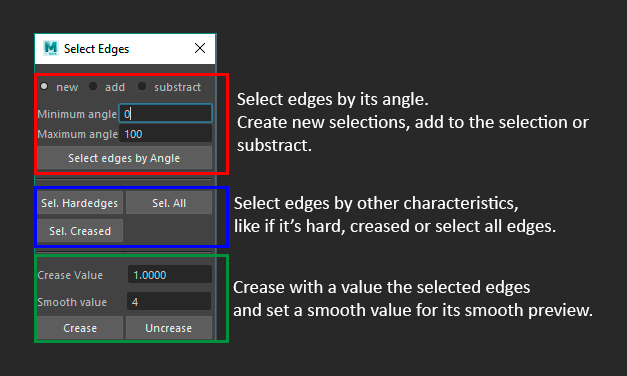 This is a tool for Maya with different ways of selecting and creasing edges.